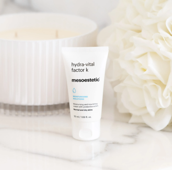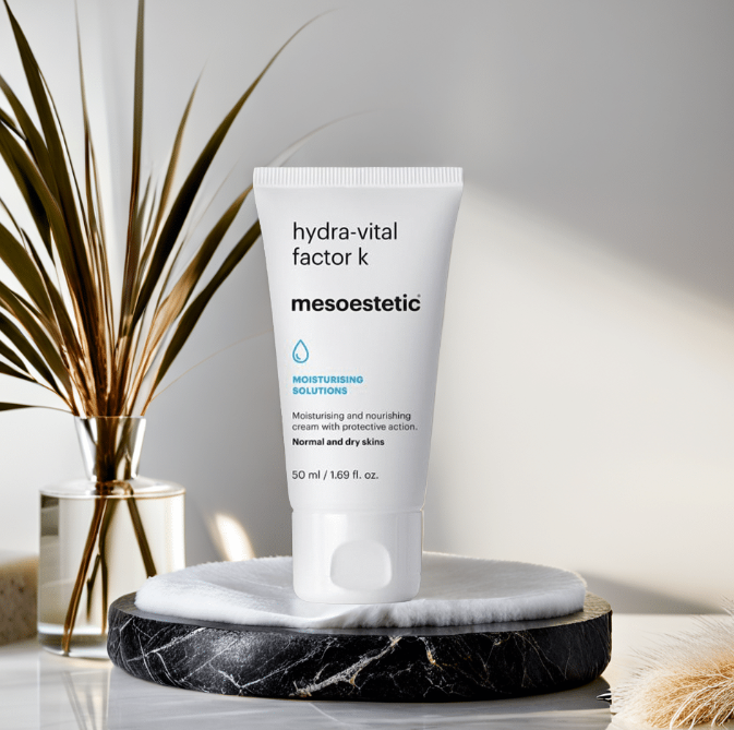 Pay image Hydra Vital Factor K на Mesoestetic е интензивно хидратиращ и подхранващ крем, създаден да възстановява баланса и комфорта на сухата, дехидратирана или чувствителна кожа. Богатата му формула с витамин Е и успокояващи активни съставки укрепва защитната бариера, предпазва от дехидратация и възстановява еластичността и мекотата на кожата. Кремът осигурява дълготрайна хидратация, като задържа влагата в дълбоките слоеве и възстановява усещането за комфорт през целия ден. Леката, но богата текстура се абсорбира бързо, без да оставя мазен филм, и придава на кожата свеж, сияен и здрав вид.