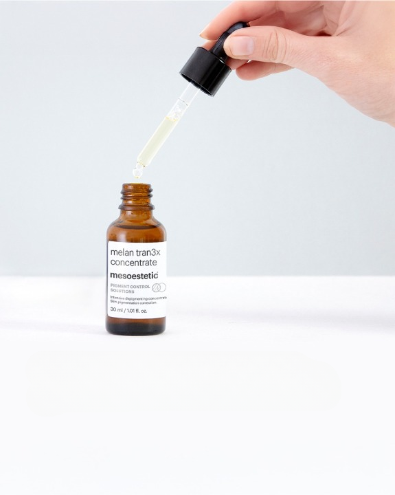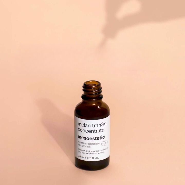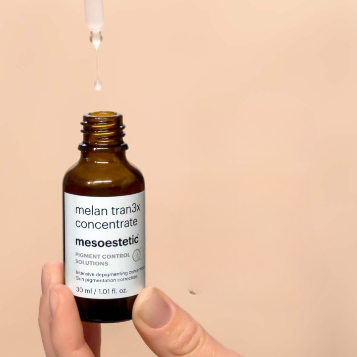 - melan tran3x концентрат. Интензивен депигментиращ агент, който действа върху прекомерната епидермална пигментация, като видимо намалява тъмните петна.