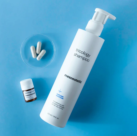 Tricology Lotion е интензивен лосион против косопад от професионалната линия mesoestetic®, създаден да стимулира растежа на косата, да укрепи фоликулите и да подобри плътността и жизнеността ѝ. Това е високотехнологичен продукт, който съчетава научни иновации и биотехнологични съставки, за да предложи цялостно решение при дифузен или сезонен косопад, изтъняване на косата и загуба на жизненост. Неговата формула съдържа растителни екзозоми (plant-based exosomes) – микроскопични носители на активни молекули, които подпомагат междуклетъчната комуникация и стимулират възстановяването на фоликулите. Те усилват действието на останалите активни съставки и спомагат за по-добра регенерация и укрепване на корена на косъма.